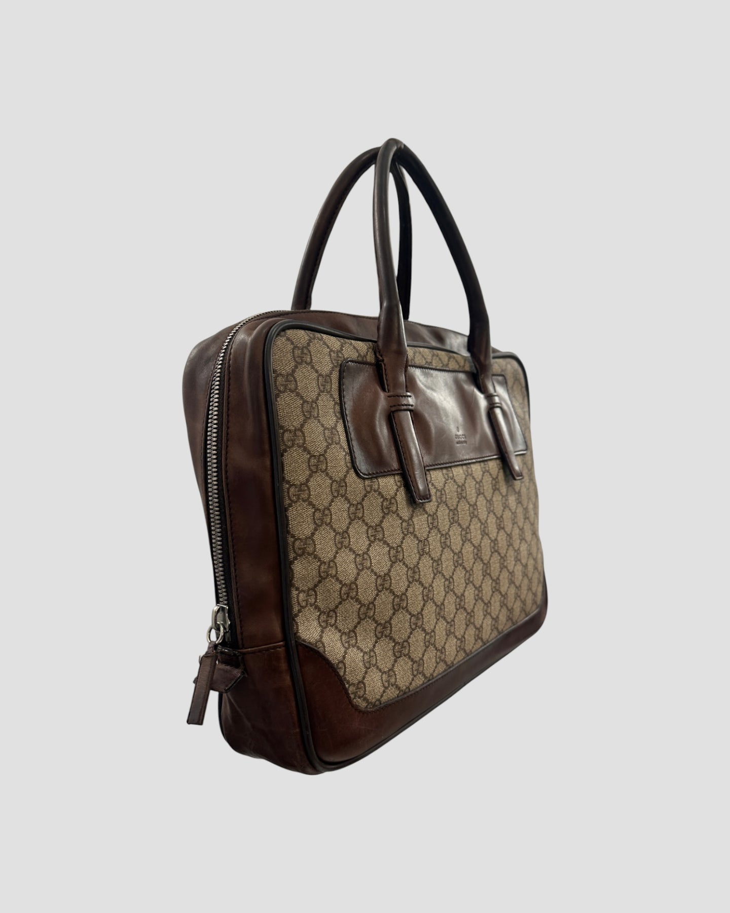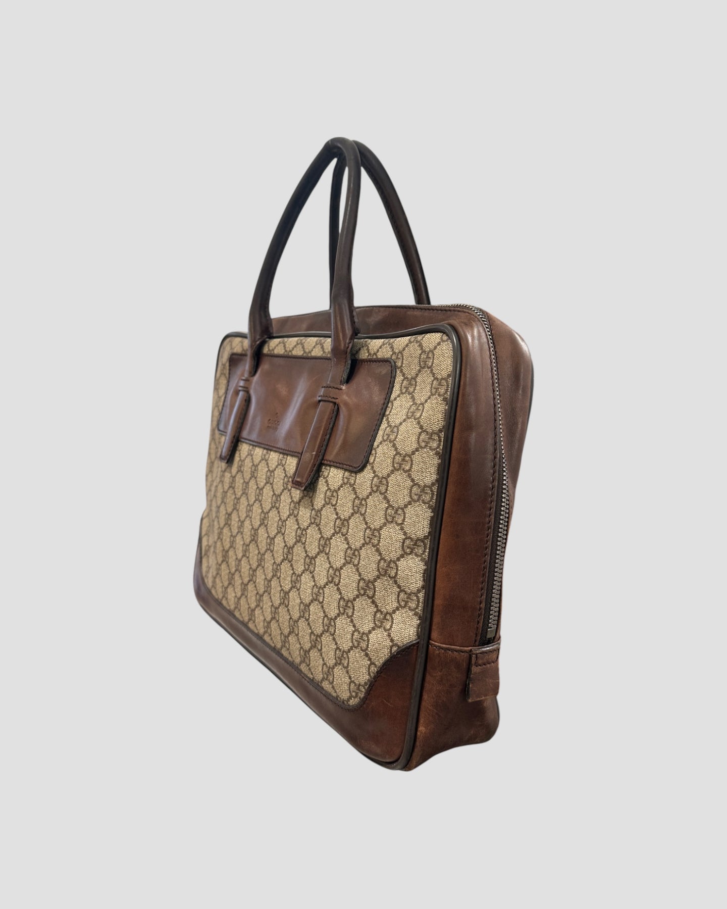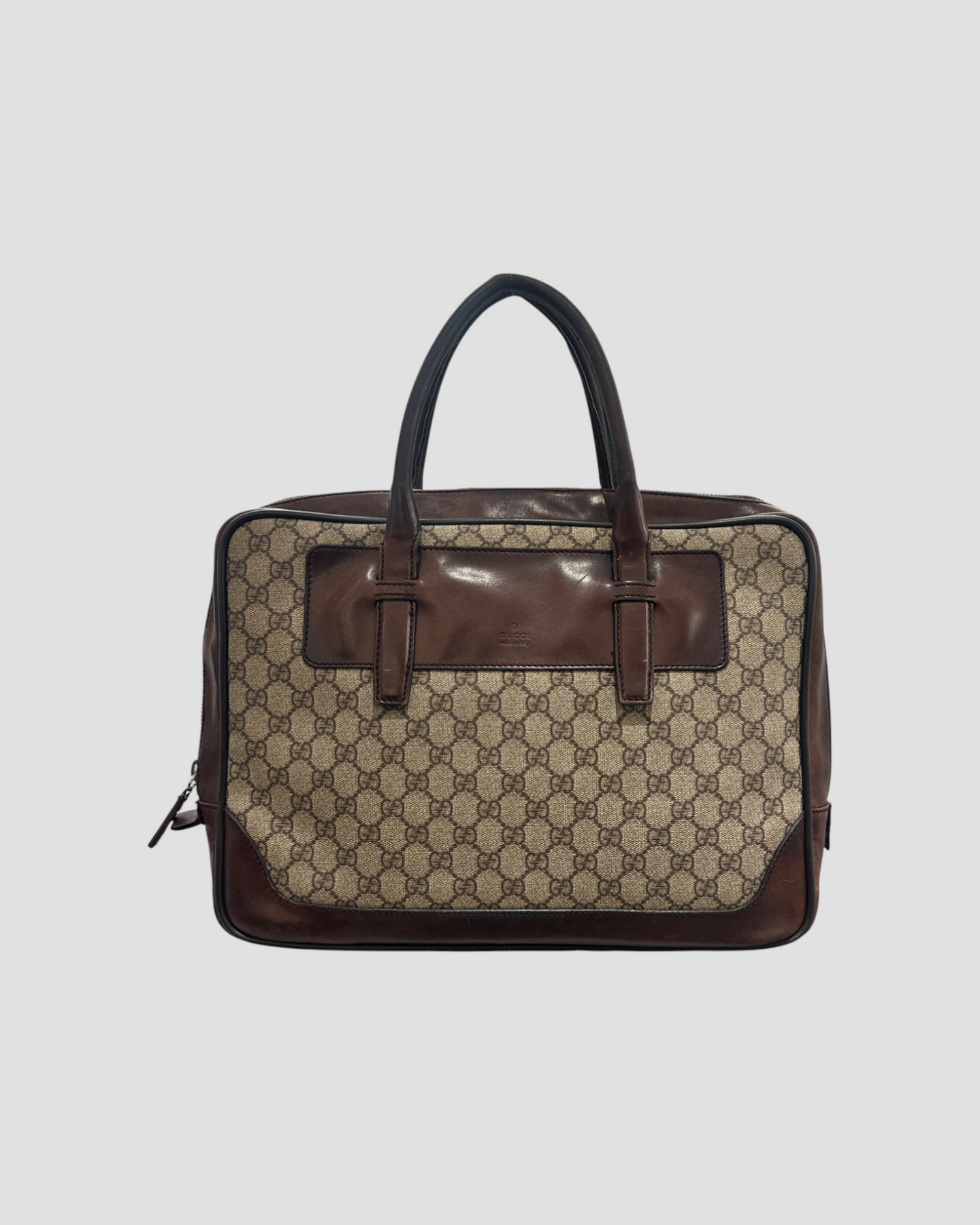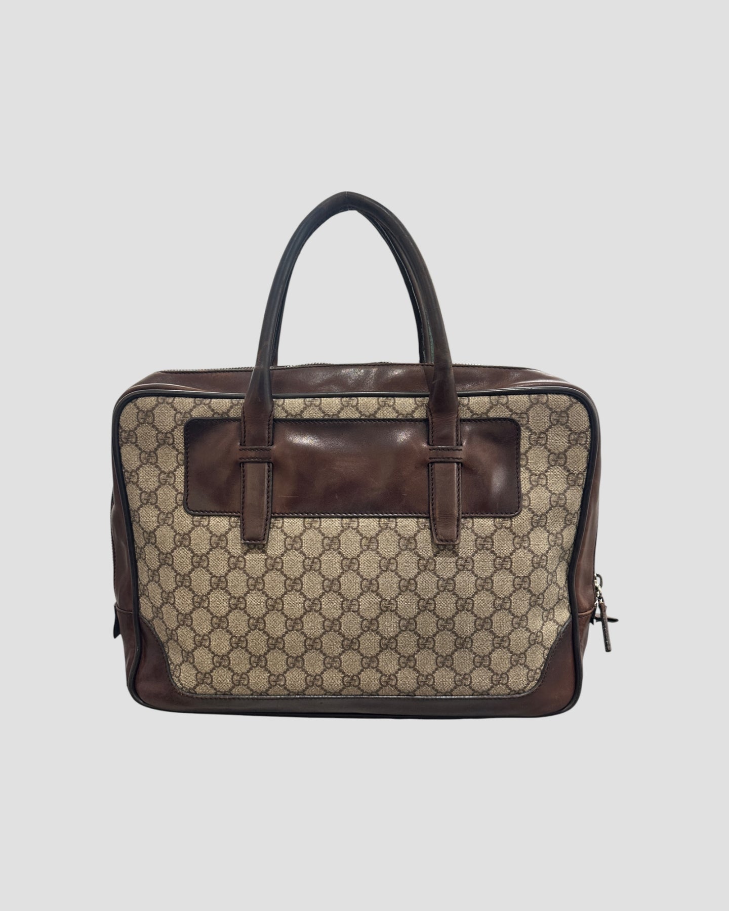 Sac Boston Gucci des années 2000 en toile GG Supreme beige et marron, emblématique de la Maison. Ce modèle à la silhouette rectangulaire est rehaussé de finitions en cuir lisse marron foncé, apportant structure et élégance à l’ensemble. Les anses rigides et la fermeture zippée en font un sac à la fois fonctionnel et intemporel, idéal pour un usage quotidien ou professionnel.