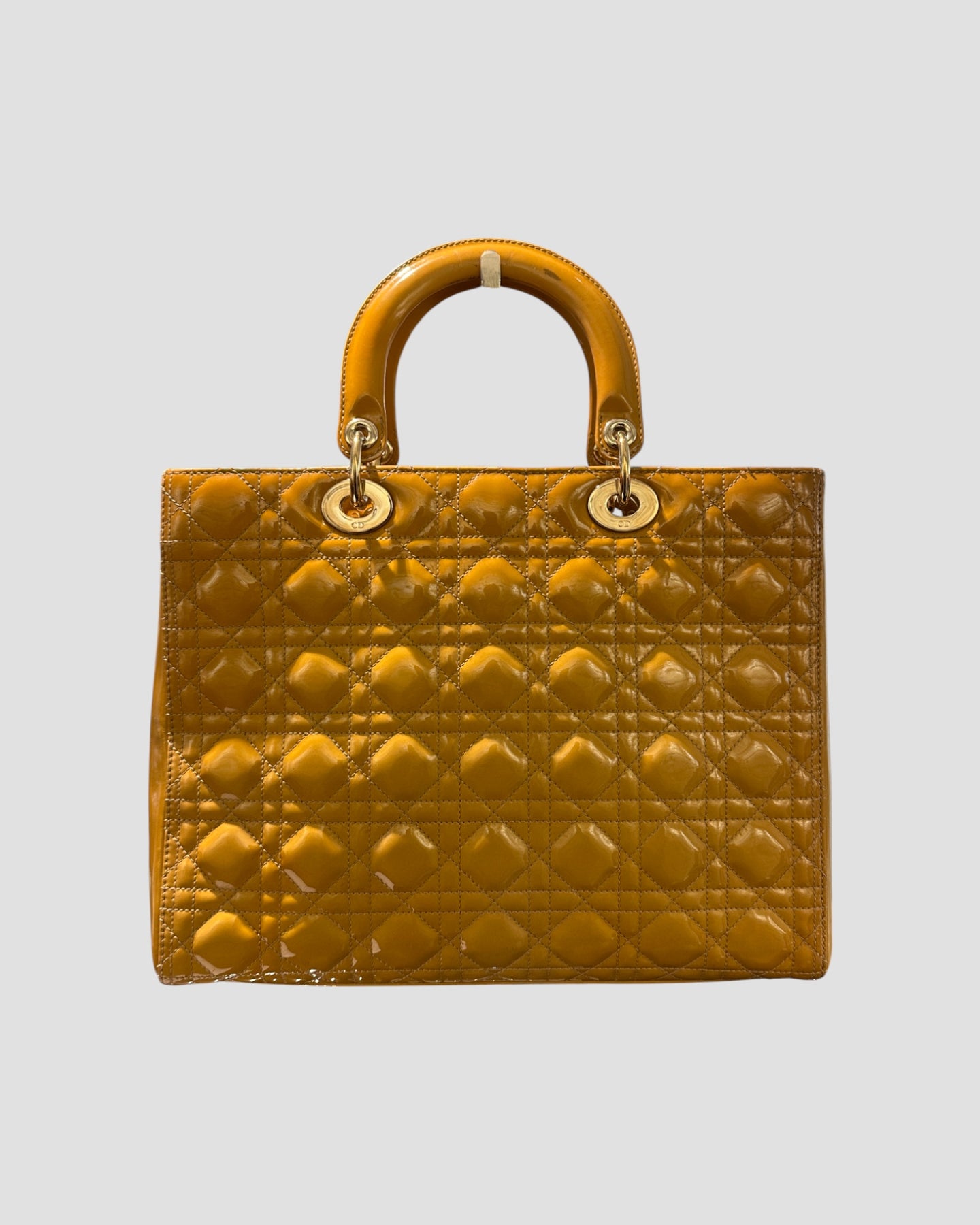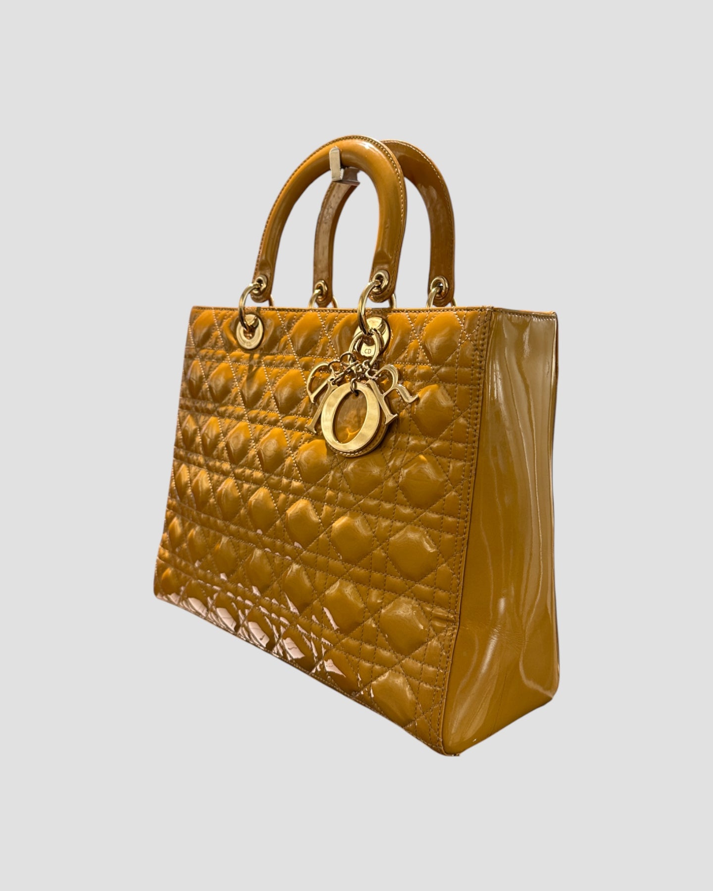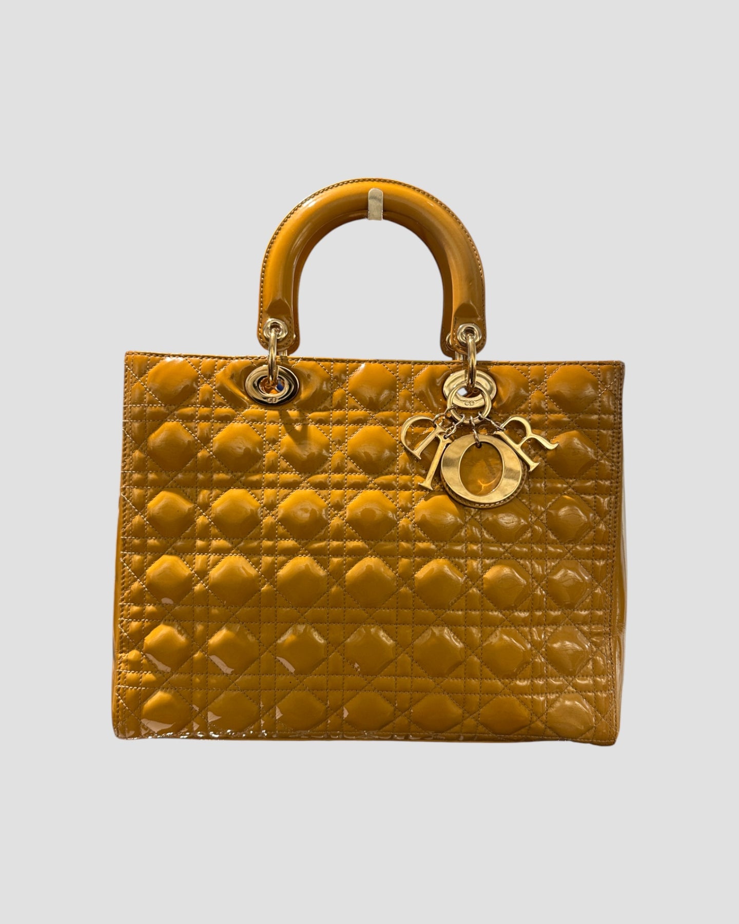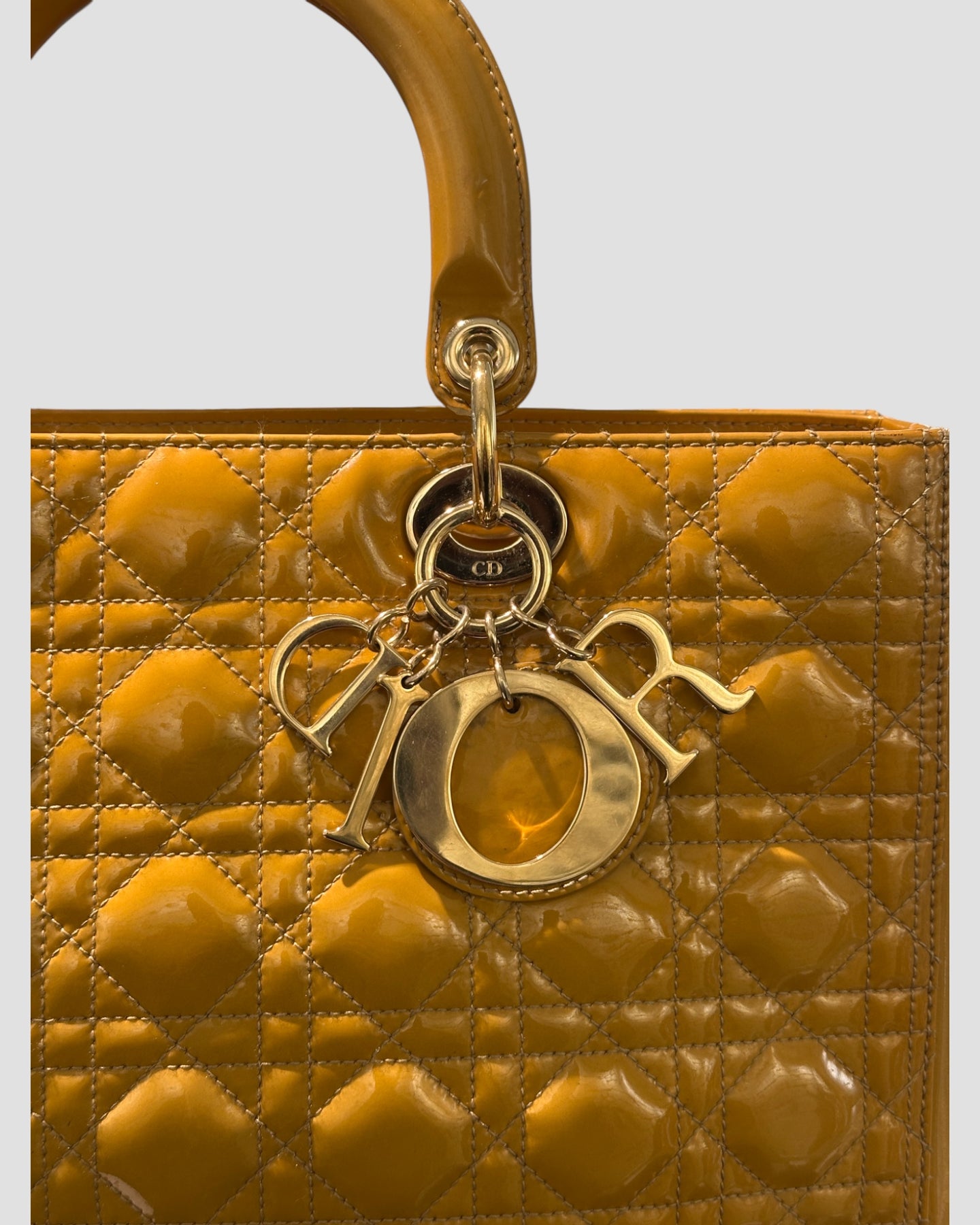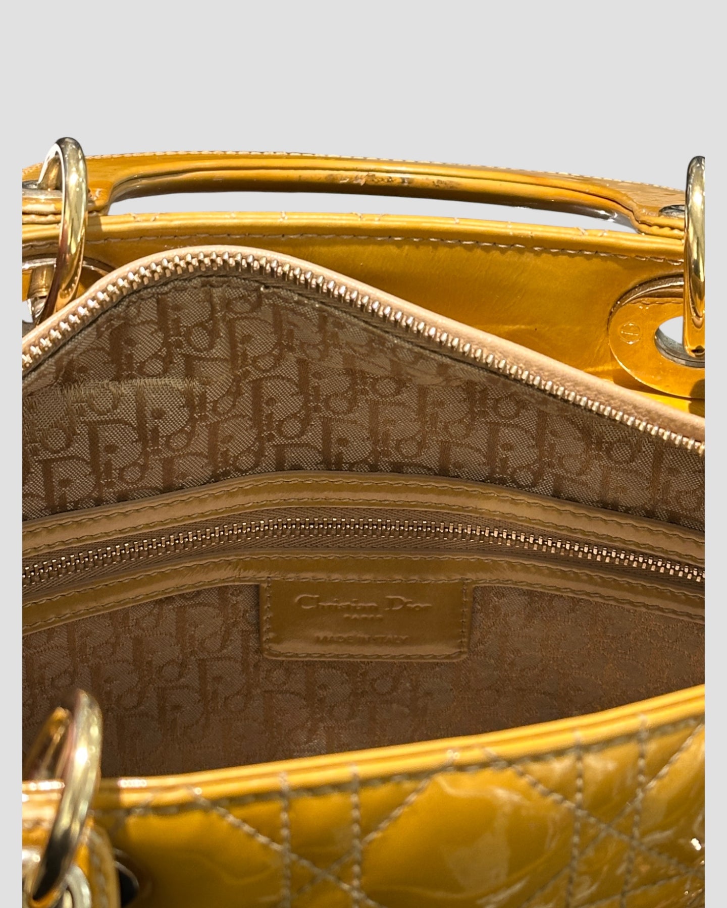 Sac à main iconique Dior en cuir verni matelassé Cannage, coloris moutarde, finitions en métal doré.