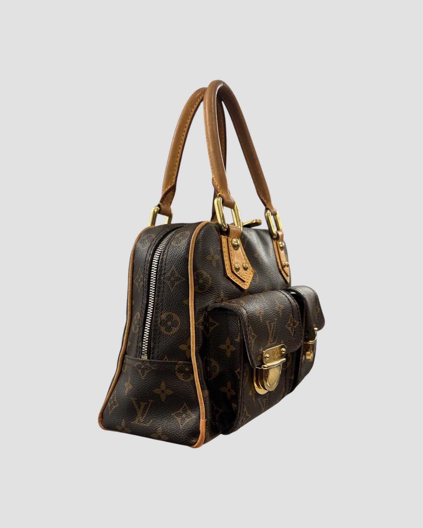 Sac Manhattan PM Louis Vuitton des années 2000 en toile Monogram iconique. Ce modèle structuré se distingue par ses deux poches frontales à rabat ornées de fermoirs dorés siglés, apportant une touche utilitaire chic à l’esthétique emblématique de la Maison. Les finitions en cuir naturel et la poignée rigide renforcent son allure sophistiquée et intemporelle.