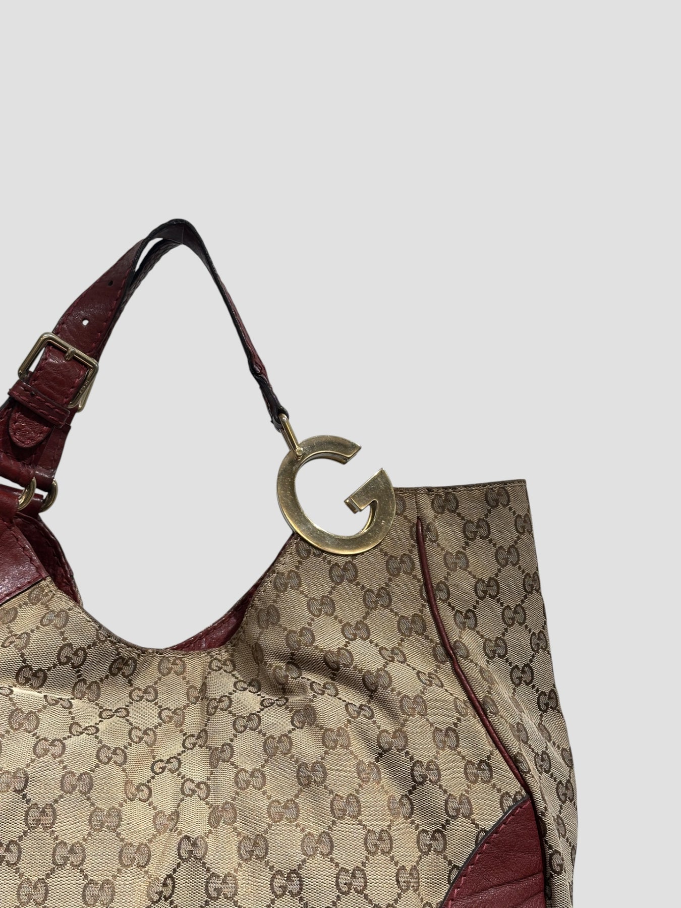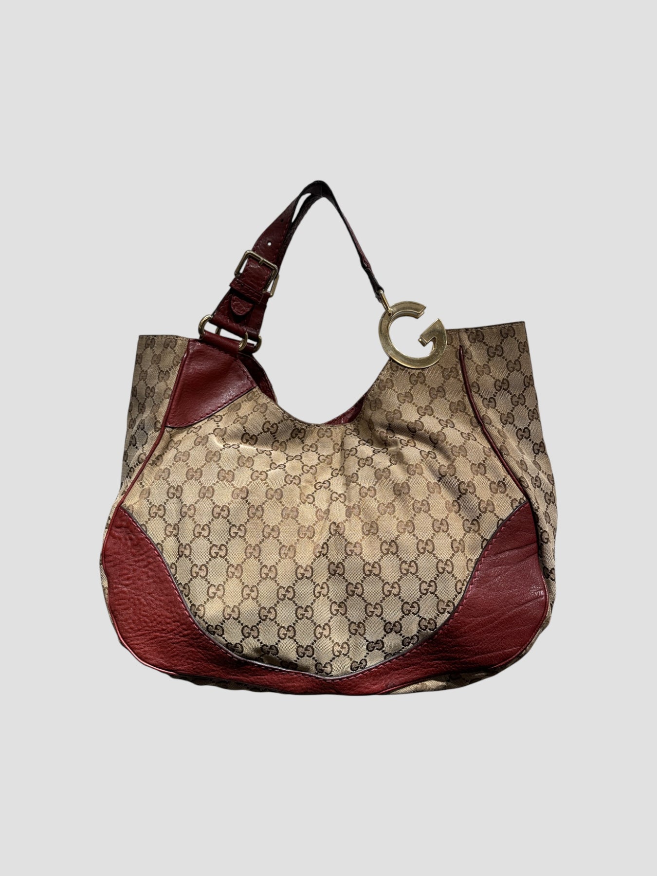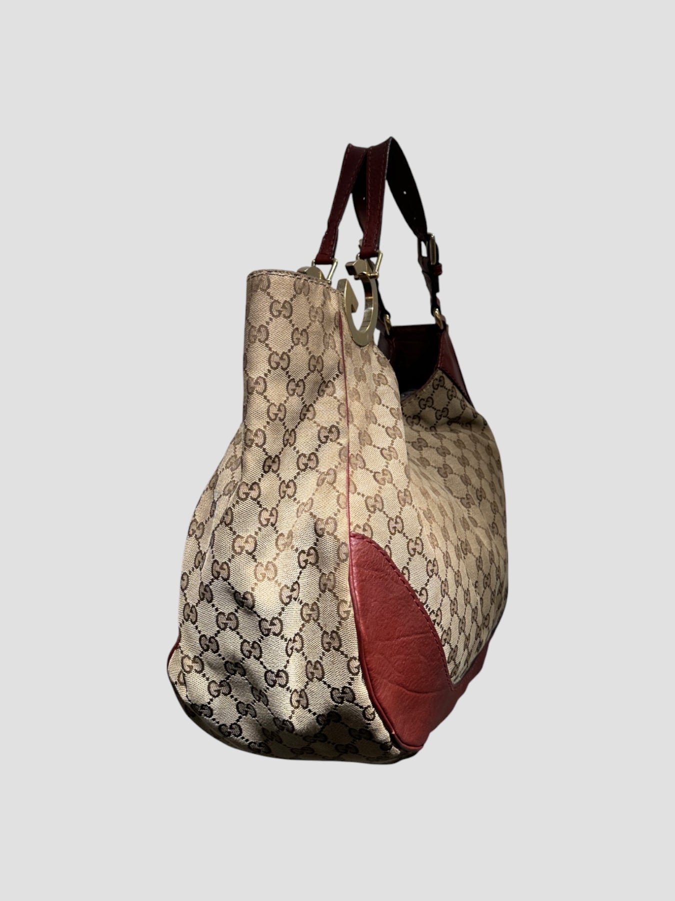 Sac épaule Gucci en toile GG Canvas beige et marron, rehaussé d’empiècements en cuir bordeaux qui structurent la silhouette. Son design arrondi et souple incarne parfaitement l’esthétique Gucci des années 2000, à la fois élégante et décontractée.