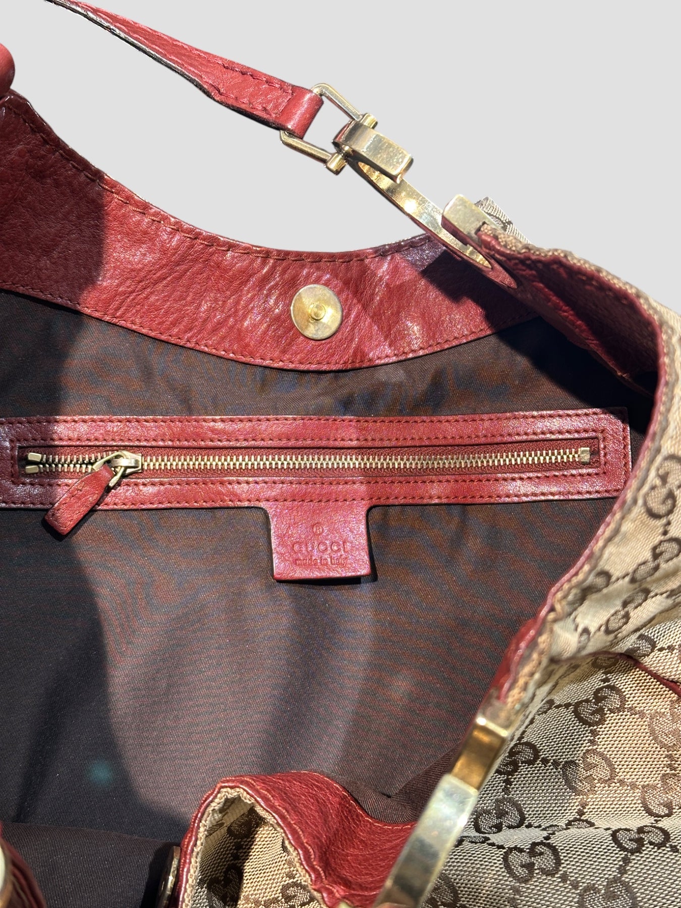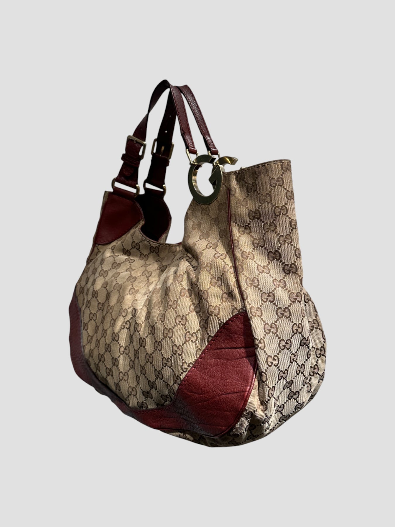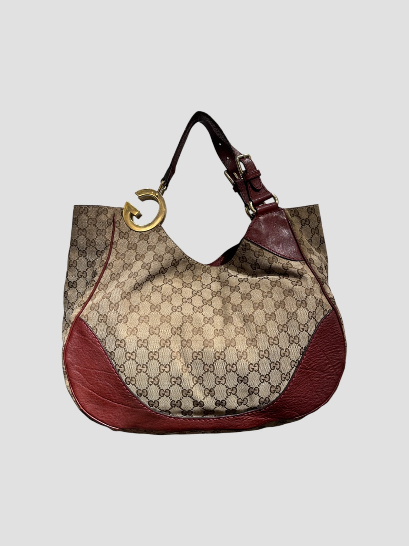 Sac épaule Gucci en toile GG Canvas beige et marron, rehaussé d’empiècements en cuir bordeaux qui structurent la silhouette. Son design arrondi et souple incarne parfaitement l’esthétique Gucci des années 2000, à la fois élégante et décontractée.